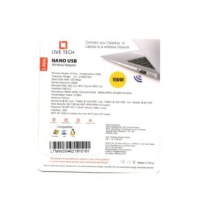 The Live Tech Wireless USB Adapter N150 WD04 is a compact and reliable solution to add wireless internet connectivity to your PC or laptop. Supporting speeds up to 150Mbps, it provides fast and stable WiFi for browsing, streaming, and online work. Its small, portable design ensures it does not block adjacent USB ports, and the plug-and-play installation allows for quick setup without complicated drivers. Ideal for upgrading older devices to wireless connectivity, the N150 WD04 is perfect for home, office, or on-the-go use.