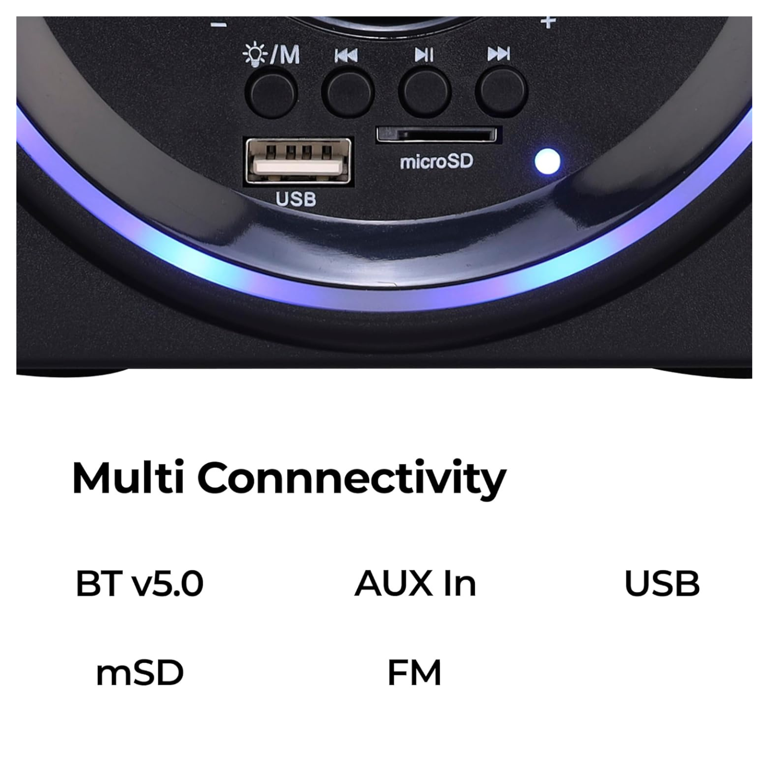 Multiple audio inputs, including AUX, USB, micro-SD card, and built-in FM radio support.